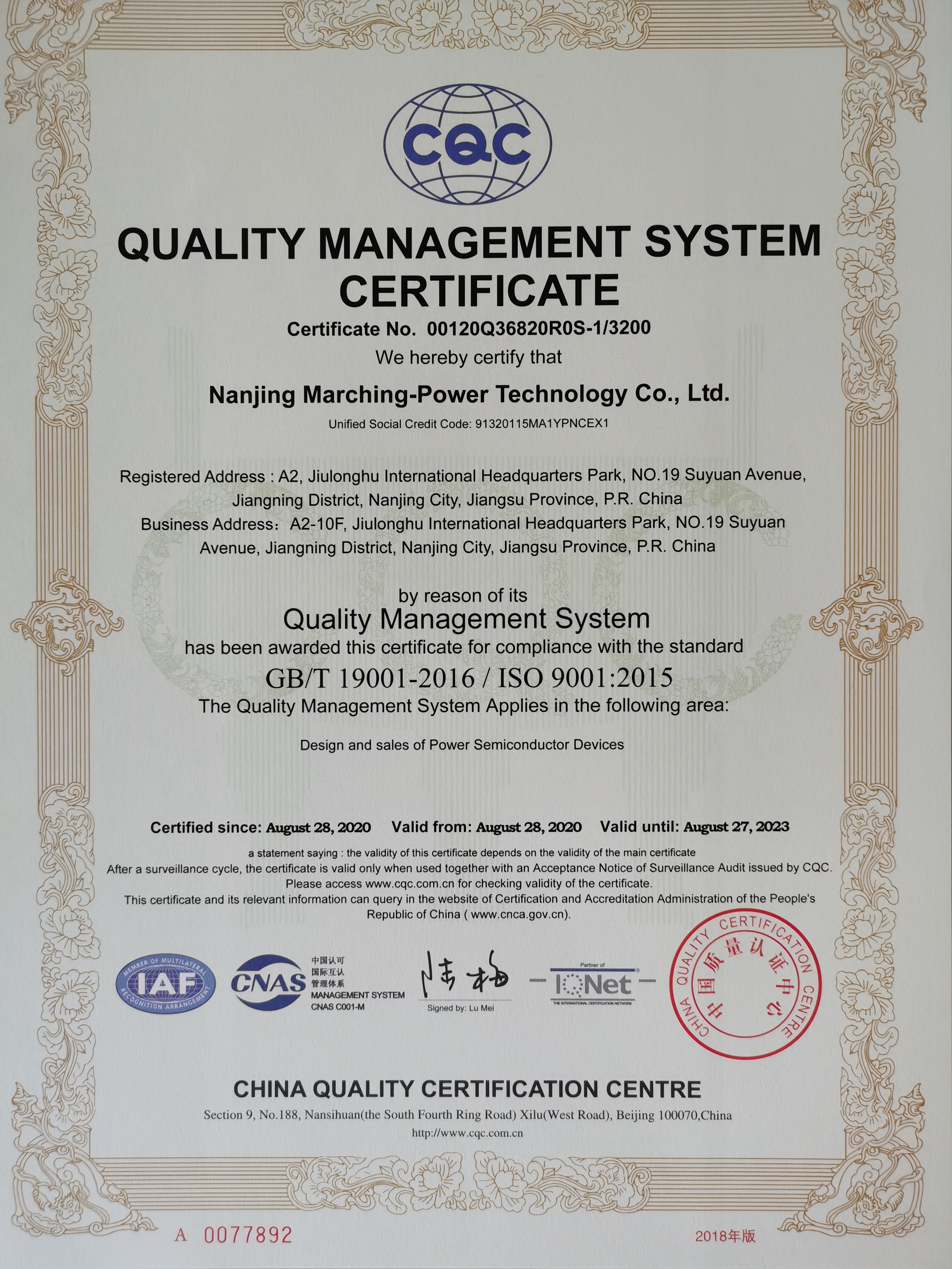 Marching Power is headquartered in Nanjing, and its manufacturing is located in Rongcheng, Shandong Province. Marching Power has established sales offices in Shenzhen, Wuhan, Xi'an and other places. The company has more than 300 employees, of which R&D engineers account over 40%. Marching Power focuses on R&D investment and accumulation of technology, the technical team consists of technical experts from the Chinese Academy of Sciences and other outstanding overseas technical talents. The company founding team members have been working for more than 20 years in power semiconductors and have gained many achievements in the field. The company has applied for 162 intellectual property rights, and has obtained 1 authorized international patent, 26 authorized national invention patents, 48 utility model patents, 7 appearance patents, 66 computer software copyrights, and 14 integrated circuit layout drawings.